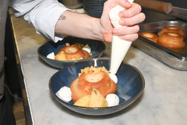 Aux fourneaux, Guillaume élabore une cuisine faite maison avec les produits frais sélectionnés sur les étals de ses fournisseurs. Ses créations gourmandes aux saveurs méditerranéennes sont à la fois simples et élégantes et toujours savoureuses comme ses plats incontournables. Ravioles aux Champignons et à la Crème de Truffe, Copeaux de Parmesan ou le Tartare de Bœuf Français Pommes Allumettes (ciselées à la mandoline). Cannes étant un « village de pêcheurs » (la plus grosse prud’homie de la Côte avec 30 pêcheurs), Guillaume met également à sa carte des plats aux saveurs iodés comme le Ceviche de Poisson (barbet, pélamide, dorade, poissons sauvages aux chairs fermes) à la Coriandre fraîche et Avocat mariné. L’été, le chef concocte une recette rare et très originale de beignets de fleur de courgette farcies. Dessert et glaces sont faites maison, dont le sorbet betterave en ce moment.