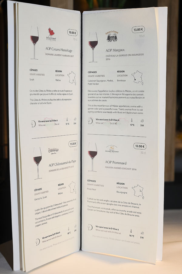 Guillaume Aragon propose également de grands crus au verre grâce au système D-Vine, un dispositif qui, grâce à une puce sur le flacon, programme la température et l’aération pour une expérience de dégustation optimale. De 10 à 14€ le verre.