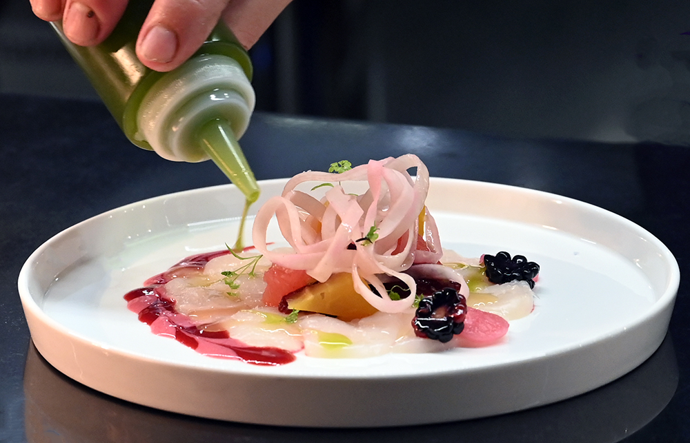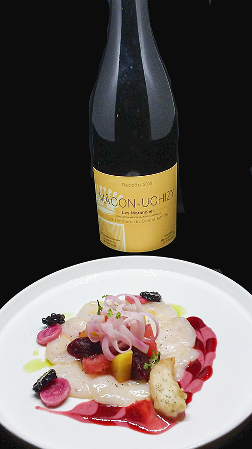 En amuse-bouche, la Guimauve de Champignons au Raifort, Pulpe de Clémentine et Carotte, Croutons de Jaunes d’œufs, arbore les couleurs des forêts. Dans un ravissement d’équilibre entre saveurs acidulées et moelleuses, les papilles s’éveillent et l’âme se prépare à un somptueux voyage gustatif. Le Carpaccio de Noix de Saint Jacques et déclinaison autour de la Betterave de Thierry Molinengo compose en entrée un tableau vivant de nature. Ce raffiné camaïeu de rouges, rosés et jaunes apporte un tourbillon de frais, vivace et envoûtant, pour un puissant effet apéritif. Une vague de saveurs précises, bien définies dans une harmonie de fraîcheur, contraste avec le soyeux des noix de Saint Jacques en fines lamelles, trésor de la mer dont le profond parfum de terre de la betterave fait ressortir la délicatesse.