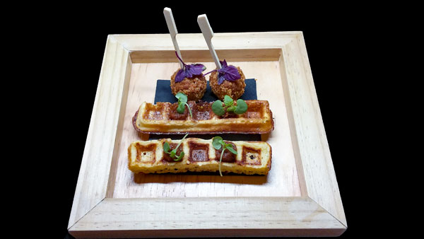Amuse-bouche: Croustillant de viande et gaufre de socca