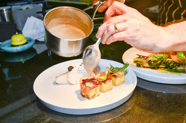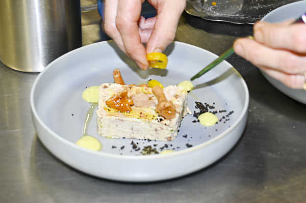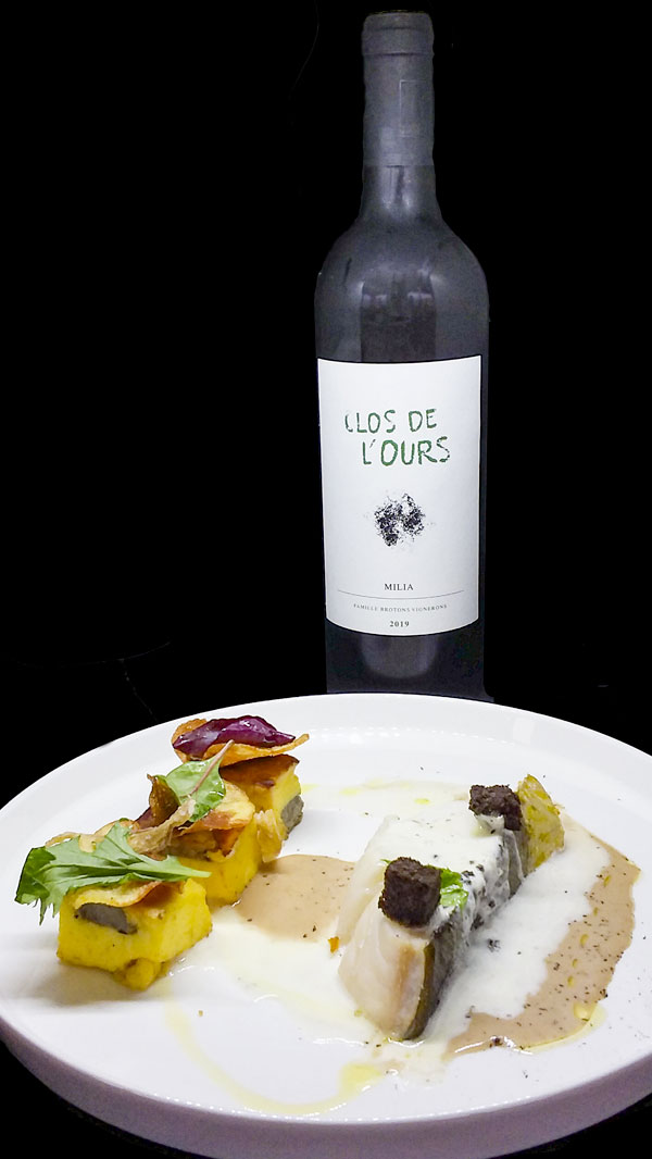 Pêche du jour, royale de pomme de terre, croutons de pain de mie à l’encre de seiche