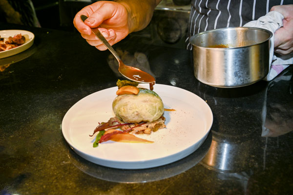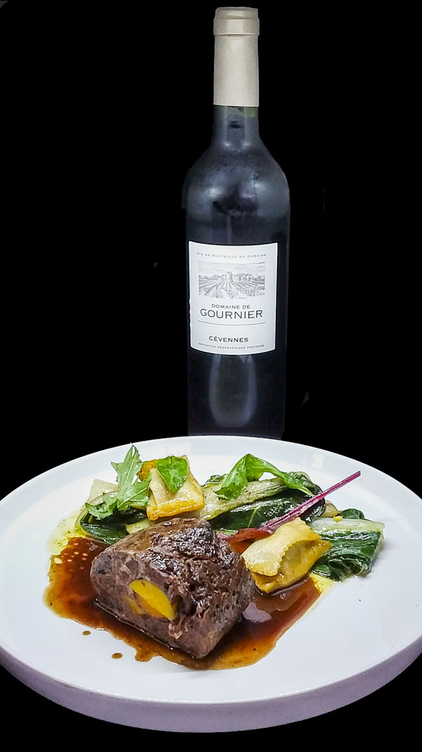 Joue de bœuf confite, agnolottis aux blettes et blédons rôtis