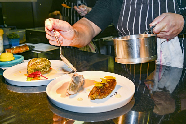 La cuisine ouverte sur la salle, où l’on peut admirer la dextérité des chefs, laisse augurer de l’authenticité et de la fraîcheur des produits et ingrédients, d’autant que les chefs travaillent sans chambre froide! Développé auprès de chefs prestigieux, leurs savoir-faire exaltent les saveurs des viandes et pêches dans le plus grand respect des produits d’exception du terroir méditerranéen. Les deux chefs prennent plaisir à régaler leurs convives en sublimant les produits de producteurs locaux passionnés, devenus au fil du temps des amis. Ces passionnés livrent tous les jours, comme Denis Génovèse, pêcheur à Antibes, ou Patricia L’Hyver-Bosi, productrice de safran bio, d’huile d’olive et de fleurs comestibles à Grasse, ainsi que de légumes, uniquement pour le Caffé.