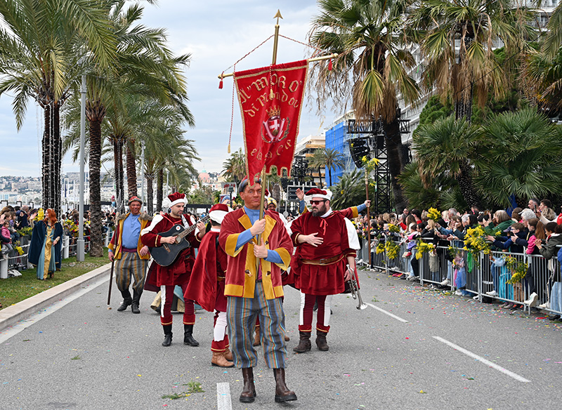 A l’origine fête païenne « Carne levare, levamen », « enlève la chair » – définition la plus usitée du Carnaval – se déroule avant la période de carême, pendant les jours gras (Mardi-gras). C’est la dernière fête avant une période d’abstinence et de cuisine maigre, qui justifie donc tous les débordements. C’est à la Belle-Epoque que le Carnaval de Nice connaît son apogée et notamment en 1830, lorsque Charles Félix, duc de Savoie et le roi de Sardaigne viennent assister aux festivités. Le premier corso accompagné d’une bataille de bonbons, confettis … entre la bourgeoisie, les touristes et la population voie le jour Cours Saleya.