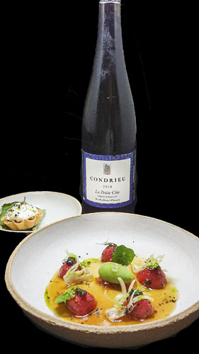 Lapin, Poulpe Fumé, Aubergine, Jus aux Girolles et Herbes des Falaises: un chef d’œuvre gourmand en forme de plat signature évoquant la Provence Marcel Pagnol, la garrigue de notre beau terroir où le lapin broute les herbes aromatiques que l’on retrouve dans l’huile qui parfume le plat: thym, sarriette, fenouil séché, romarin… La girolle déploie dans le jus soutenu à souhait ses parfums forestiers croquants en contraste avec le iodé du poulpe. En clin d’œil à la tradition, une moutarde parfumée aux girolles, à base de moutarde ancienne faite à la meule de la maison Fallot à Beaune.