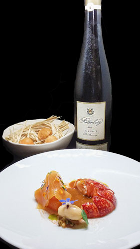 Homard Fumé à l’Hysope, Melon rôti sans cuisson, Barbajuan des Pinces: le prince des mers, délicatement fumé à l’hysope, plante aromatique ancestrale aux frais parfums des garrigues, se marient à merveille à la douce saveur parfumée du melon. Les sucs concentrés de la carapace et parements du homard rehaussent délicieusement la chair iodé du luxueux crustacé.