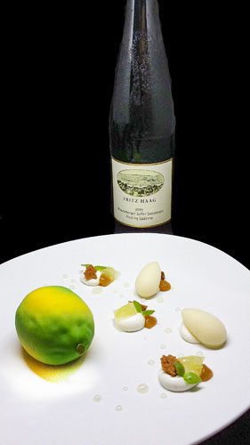 Vision d’un Citron de Pays, parfumé au Yuzu et Combava signé du chef pâtissier Julien Dugourd: « J’ai toujours aimé le citron, je mangeais toujours de la glace au citron quand j’étais enfant ». Avec ce rafraîchissant et pétillant dessert, le chef pâtissier Julien Dugourd livre avec élégance et génie, sa version signature pâtissière du célébrissime agrume de pays, star de la Fête du Citron annuelle à Menton. Le bonheur de douceurs gentiment acidulées se découvre en découpant dans sa longueur la coque de chocolat blanc du citron en trompe-l’œil: génoise, mousse et crémeux déploient leurs percutants parfums de yuzu et combava. Un bouquet final qui signe de façon magistrale un festival de saveurs gourmandes et ensoleillées.