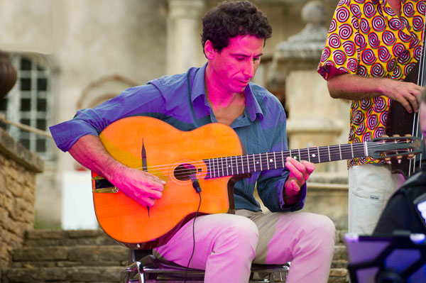 Avant chaque morceaux, Michel Pellegrino a fait revivre des épisodes de la vie du génial guitariste. Django Reinhardt a inspiré beaucoup de musiciens, certains de ses adeptes allant même jusqu’à s’immobilier deux doigts à la main gauche pour retrouver les « plans » de Django qui avait perdu deux doigts lors de l’incendie de sa roulotte. Alors qu’à l’époque il jouait du banjo, il a rééduqué sa main en jouant de la guitare et a ainsi créé ce style si particulier qui l’a rendu célèbre dans le monde entier. Douce Ambiance, Swing 42, le chef d’œuvre Nuages – dédié à Valérie Rousselle – Belleville (quand Jo Privat, le Gitan blanc, ouvrait la fenêtre de son appartement à Belleville, il apercevait la roulotte de Django venu faire le bœuf avec lui), Daphné, Djangologie et pour finir Les Yeux Noirs, ont transporté les mélomanes sur les chemins jazzy de Django, dont les yeux brillaient de plaisir comme les étoiles scintillant dans le ciel de cette belle nuit d’été. Un exceptionnel moment de musique, de partage et de convivialité au Château Roubine, dans le parc peuplé des sculptures cosmiques de Breteau, peintre officiel de la NASA.