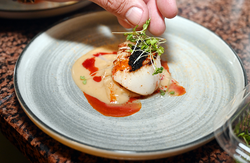Mise en bouche : Noix de Saint Jacques, Jus de Barbes, Martini Dry aux Agrumes, Caviar de Madagascar, Mousseline de l’instant aux Algues, Huile de Paprika, Homard