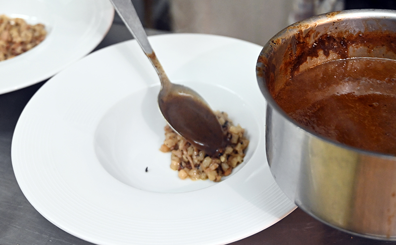 Entrée : Œuf Parfait cuit à 63.5, Risotto de Céleri Rave aux Brisures de Trompettes de la Mort, Poulet grillé, l’Oignon, Jus de Viande truffé et Noisette