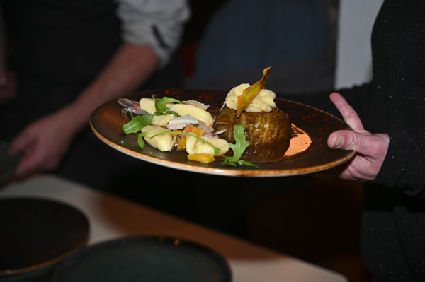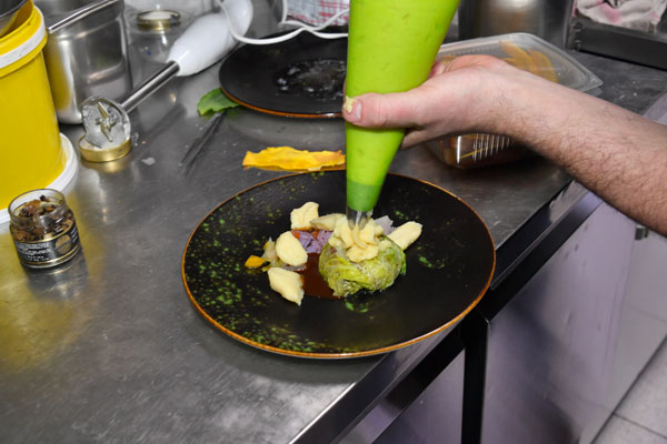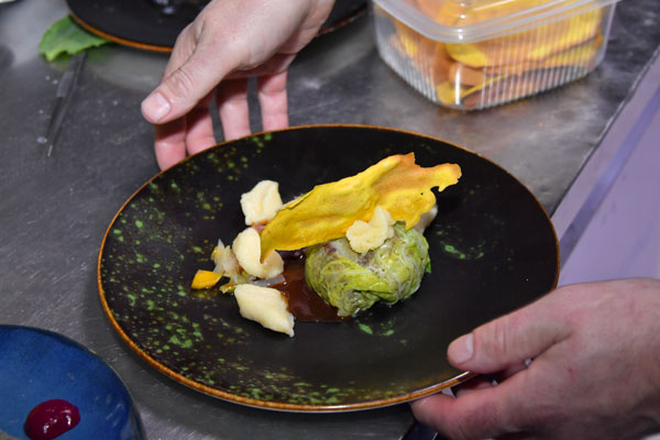 Pour la réalisation de son Paleron Braisé au Porto, gnocchis aux légumes, racines, le Chef a fait braiser la viande pendant de longues heures en basse température. Il a ensuite utilisé du Porto et du vin rouge pour la réduction de son jus corsé. Les légumes du chou ont été égouttés, hachés, assaisonnés, le savoureux tout complété par des bettes et des condiments. Le chef a ensuite formé les sphères avec des feuilles de choux préalablement blanchies et cuites au four. Complété de gnocchis concoctés à base de pomme de terre et de panais, ce plat de roi surmonté d’une tuile de curcuma a fait chavirer les palais les plus exigeants des gastronomes réunis aux 3 Marmottes.