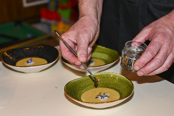 Amuse-bouche: pour les Chefs au Sommet d’Auron, Stéphane Furlan a composé un menu gourmand, élégant et raffiné, d’inspiration méditerranéenne. Dans un esprit de terroir, les produits azuréens étaient sublimés par une cuisine d’une extrême précision, des pointes d’assaisonnement à faire grimper les papilles au septième ciel et des jus plus qu’éloquents. Pour son Velouté de Courge de Nice au Chou kale, émulsion à la truffe, le chef s’est inspiré des conseils d’une productrice locale. Cuisinée à base d’une crème butternut et citrouille, cette nouvelle création absolument sublime a été peaufinée en y ajoutant de l’oignon, du poireau, de la pomme de terre. Enfin pour rehausser le goût et rendre ce met plus festif, Stéphane a ajouté une émulsion de truffe de la Maison Signorini à Vence, et, pour faire honneur à la saison, une petite fleur de bourrache.