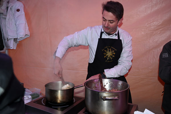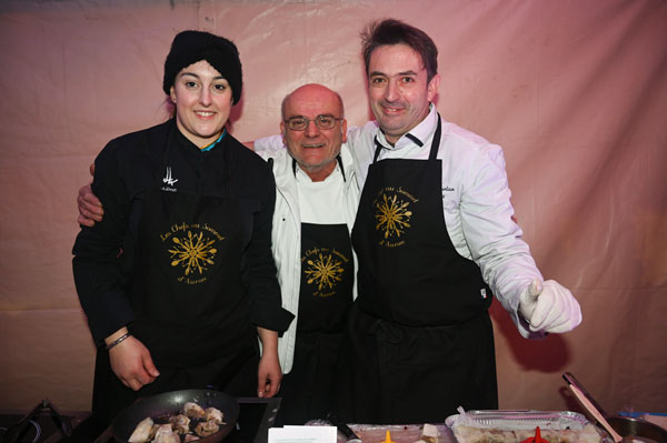 En guise de mise en bouche gourmande des Chefs au Sommet d’Auron, les Maîtres Restaurateurs des Alpes Maritimes, représentés par Théo Mansi, leur Président, ont régalé le nombreux public de gourmets venu assister à l’inauguration. Au menu des dégustations: Strudel de Canard confit avec pommes, cannelle, raisins de Stéphane Furlan Sansot à Tourrettes sur Loup, Risotto au Safran du Mercantour par Théo Mansi, des Maîtres Restaurateurs et Chèvre frais du pays, Pickles de Radis noir et et Petit Epeautre de Guillaume Arragon du Bistrot Gourmand à Cannes, aiés dans la réalisation de ces délices par Jérôme Clavel du 44 à Antibes et sa brillante seconde Mylène Treizières.