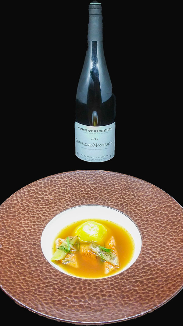 Plat: Rouget Brûlé à la Flamme et bouillon de roche parfumé à la citronnelle