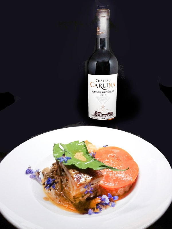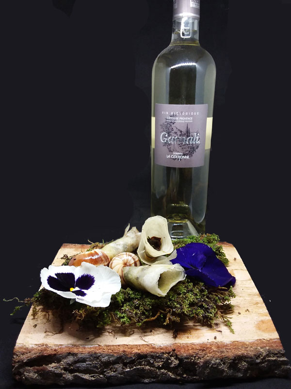 Amuse bouche: Croustillant aux Escargots d’ici en Persillade et Tapenade d’Olives Noires. Sur leur environnement de verdure mousseuse, trois « petits gris », des cagouilles bien de chez nous, nous régalement de leur chair succulente relevée des saveurs prononcées du persil et de la tapenade.