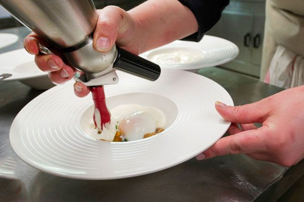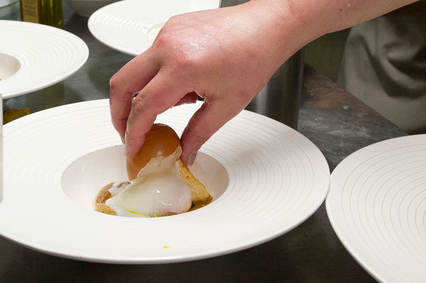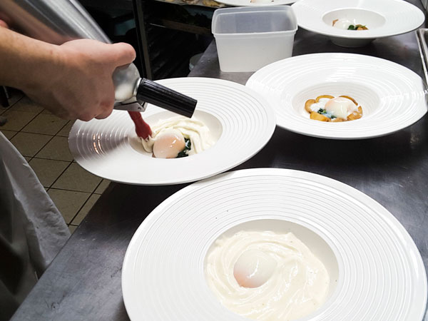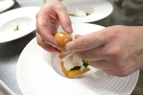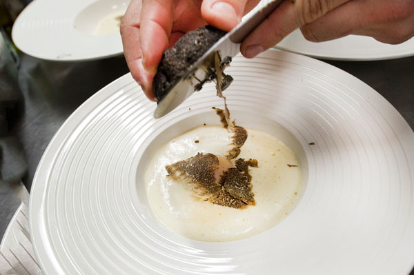 Entrée: Oeuf parfait, Tombée de pousses d’Épinard, velours de pomme de terre à la truffe Tuber Mélanosporum.