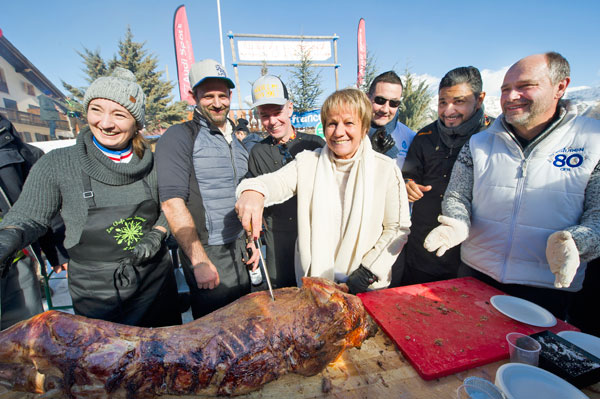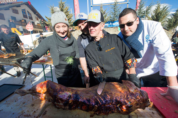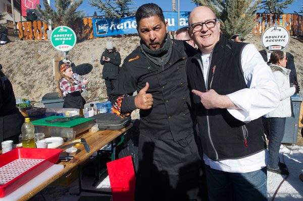 Sous la flamboyante tenue des Toques Brûlées, joyeusement animées par le chef David Faure de SensÔriel à Nice, Les Chefs au Sommet d’Auron ont offert plus de trois heures de bonheur gourmand aux skieurs et patineurs, touristes et habitants d’Auron, en animant avec leurs barbecues géants un show d’Art Culinaire d’une rare intensité. Dégustations de recettes « faites minute », spécialités mitonnées à la chaleur des braises de l’amitié et de la générosité, étaient distribuées à tour de bras à un public enchanté. Le triple Champion du Monde de sculpture sur glace Mario Amégée a brisé la glace en sculptant des formes en cristal pour immortaliser le moment en se faisant tirer le portrait.