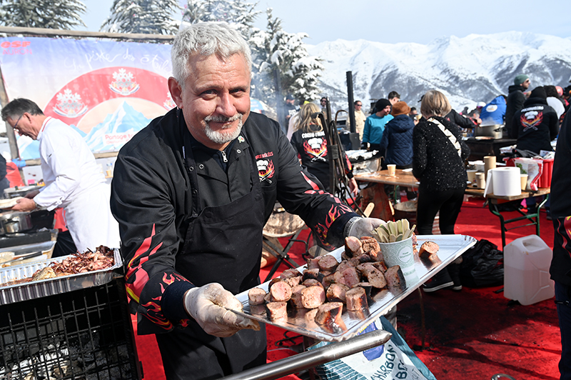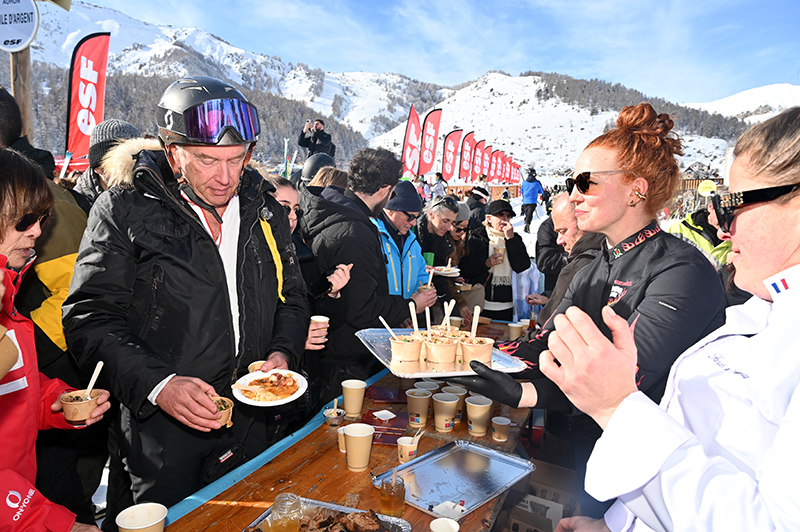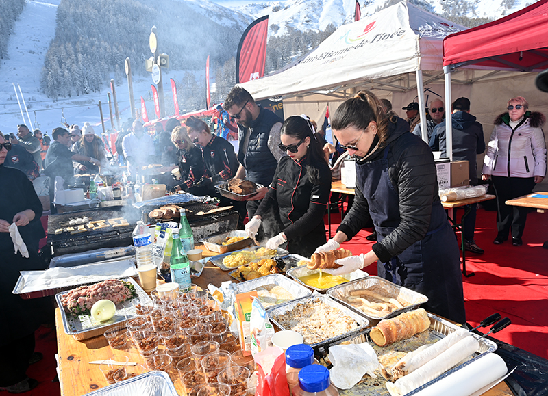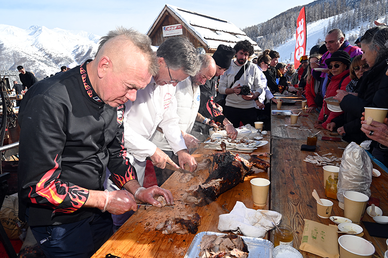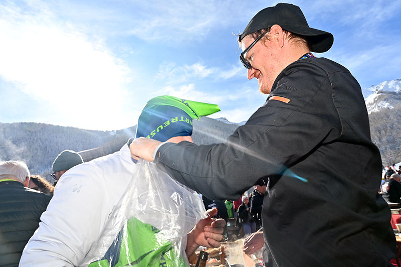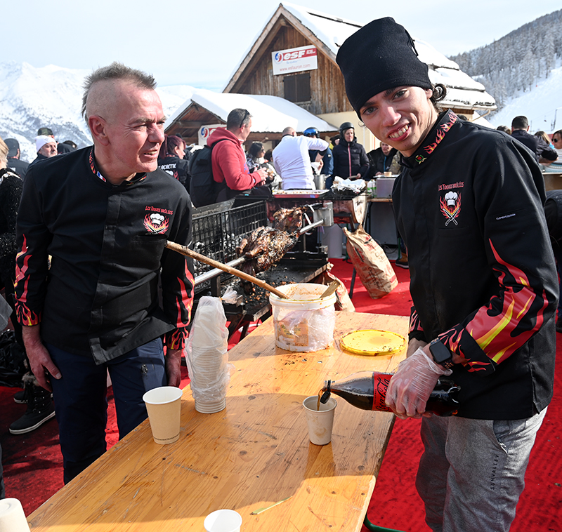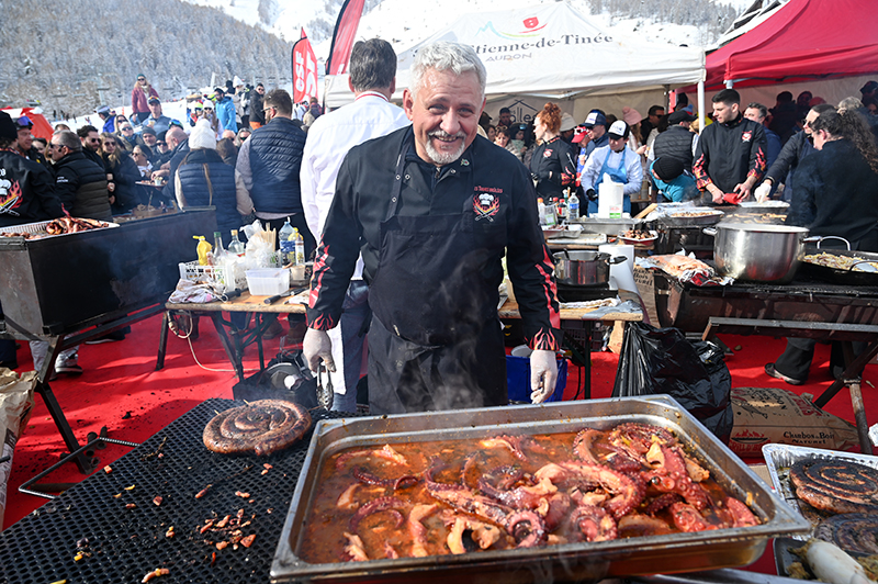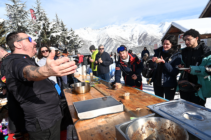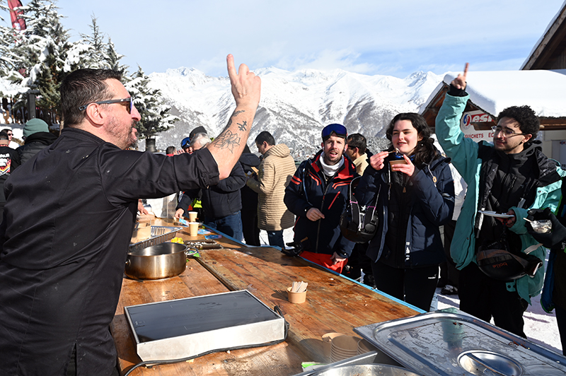 Dès le matin, les effluves de grillades ont envahi la station, annonçant un moment placé sous le signe du plaisir simple et du goût authentique. Autour des braseros et des planchas, les chefs des Toques Brûlées ont orchestré un ballet gourmand, proposant des grillades généreuses (Agneau de St Etienne de Tinée – Bergerie de la Belloire), cuisinées « minute » dans un esprit de partage et de convivialité. Ici, pas de barrières : on échange, on goûte, on discute, on rit… La montagne devient un immense lieu de vie.