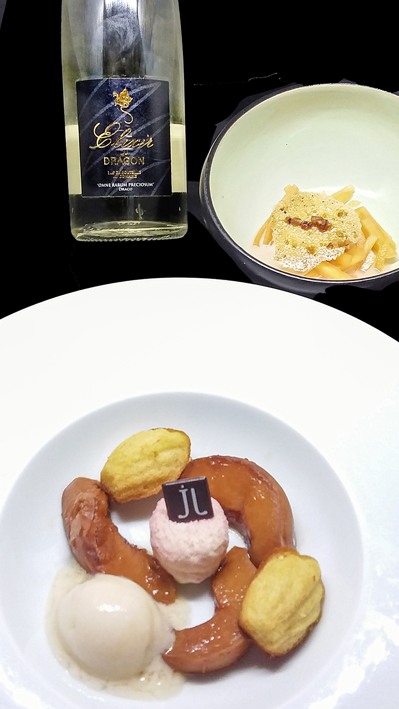 Dessert autour de la Pêche et de la Verveine, mousse à la Verveine, madeleine au safran et au miel de Jean-Philippe Mansart à Draguignan, crème glacée à la pâte d’amande, romarin du jardin. Fraîcheur de Melon rafraîchi à la menthe. Granité Pastèque, émulsion à l’eau de melon, noix de pécan caramélisé.