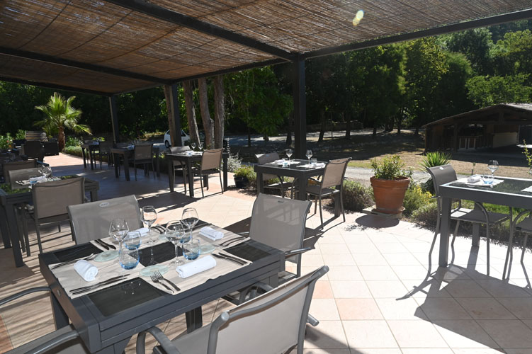 Meublée de tables métal et verre et de chaises légères, en compagnie de grosses barriques, la terrasse ombragée ouvre sur un vaste parc où les enfants peuvent gambader à loisirs en toute sécurité.