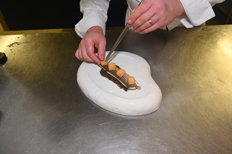 Le Mulet de Méditerranée, compotée d’Aubergine, jus de volaille à l’olive, cube de panisse croustillant, écailles de courgette Trompette.
