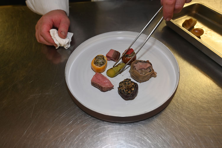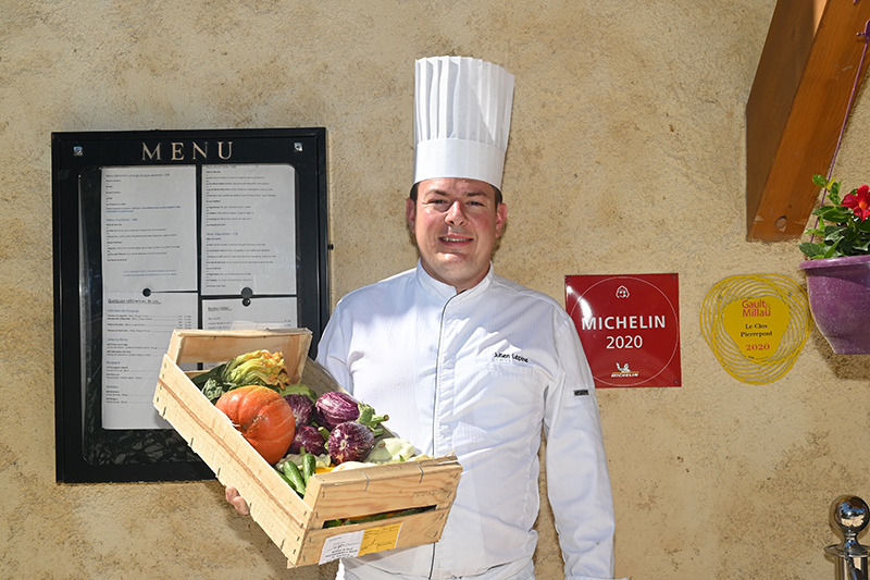 A l’Auberge du Teillon, Julien succédait à ses parents détenteur pendant 25 ans d’un Bib Gourmand et devait imposer progressivement sa « patte ». Mais au Clos Pierrepont, le chef peut vraiment exprimer son identité dans la saisonnalité et le retour à la nature. Cela se traduit par une priorité aux beaux produits de producteurs locaux avec qui il a besoin de sentir des affinités pour « trouver du sens et partager avec les autres la vision du produit ». Agneau de Nans Bellini, un ami d’enfance, au GAEC du Graou à Chateauvieux, fromages de la Ferme de la Pastourelle toute proche à Chateaudouble, un village d’où viennent également les pommes, poires et tomates de Bruno Debon, le Bio d’Olivier à La Seyne-sur-Mer pour de rares échalotte noires, safran et miel de Jean-Philippe Mandat à Draguignan. En amoureux de la « belle cuisine », Julien Lepine travaille également les ris de veau, le pigeonneau, le foie gras, ou encore le caviar.