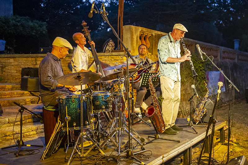Dans le somptueux parc du Château Roubine, une énergie positive dégagée par la virtuosité et la chaleur de Cor Latina a rapidement gagné corps et âmes, avides de retrouver l’insouciance des jours heureux. C’est ce monde enchanté et joyeux que Michel Pellegrino, clarinettiste de renommée internationale, accompagné de Romain Thivolle à la guitare, Jean-Marc Pron à la contrebasse et Corentin Lucas aux percussions, a partagé avec le public de mélomanes en interprétant des grands standards de Jazz Latino et d’autres plus intimistes.
