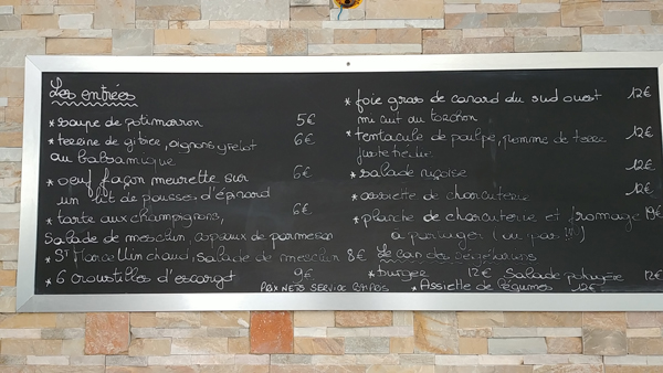 Dans sa cuisine, Alexis fait chanter ses poêles et ses casseroles au son du terroir méditerranéen. De la terre à la mer, il sublime les produits avec beaucoup de justesse et de tendresse. Les mets simples, généreux et rassurant qu’il concocte avec amour sont frais et de saisons. Les risottos (Saint Jacques, Gambas, cèpes, morille…) ou le poisson (daurade, thon…) qu’il cuisine vous étonnerons par leur simplicité et leur goût. En entrée, (entre 5 et 12 €), la Soupe de Potimarron, la Tarte aux Champignons Salade de Mesclun et Copeaux de Parmesan, la Tentacule de Poulpe mariné, Pomme de Terre juste tiède ne vous laisseront pas indifférent. En plat (entre 12 et 22 euros), les Rognons de Veau à la Moutarde, Écrasé de Pomme de Terre, la Blanquette de Veau à l’ancienne, Riz Pilaf, le Filet de Daurade poêlé croustillant, Gnocchi au Basilic, Émulsion de Thym, le Burger Végétarien. Et selon l’arrivage du marche et l’inspiration, un le plat du jour à 12 €. Les desserts (entre 6 et 8 €), , le pain et les glaces fabriquées tous les matins dans le laboratoire de l’Antidote finirons de séduire les palais les plus délicats.
