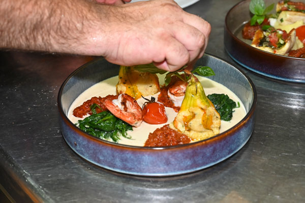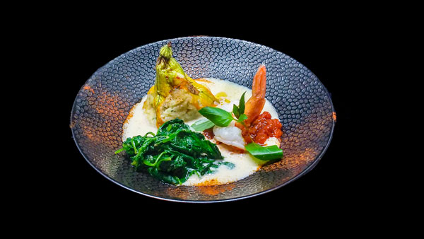 Fleurs de Courgette Farcies au Cabillaud, Gambas Rôties, Tombée d’Épinard, Velouté de Parmesan
