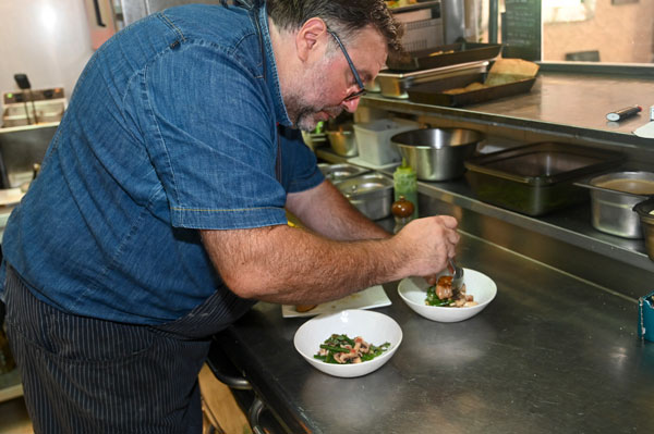 Angel Aparicio aime à sublimer les produits des pêcheurs et petits producteurs locaux animant les allées du Marché Forville (Marius, Alain, Christophe, Maryse, Annie…). Le chef privilégie les circuits courts et met à sa carte la pêche du jour: un coup de coeur pour le dorin pêché en Baie de Cannes dans la nuit et trouvé au petit matin sur les étals cannois. Fruits et légumes de la Famille Vial, herbes aromatiques – basilic thaï, coriandre, persil – des maraîchers Claude et Estelle Pons à Grasse (également tomates, salades…) se dorent dans ses casseroles avec les fleurs de courgette d’Adrien à farcir, le pourpier d’Antoine… Les moules de bouchot du Mont-Saint-Michel, le bœuf Simmental, l’agneau de Sisteron complètent cette alléchante ardoise.