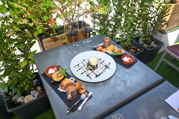 Café Gourmand: Carpaccio de Fraise, Glace Yaourt. Sabayon de Figues Gratinées. Fondant au Chocolat, Crème Glacée à la Vanille. Brioche Perdue, Glace Mandarine. Madeleine et Rocher Coco.