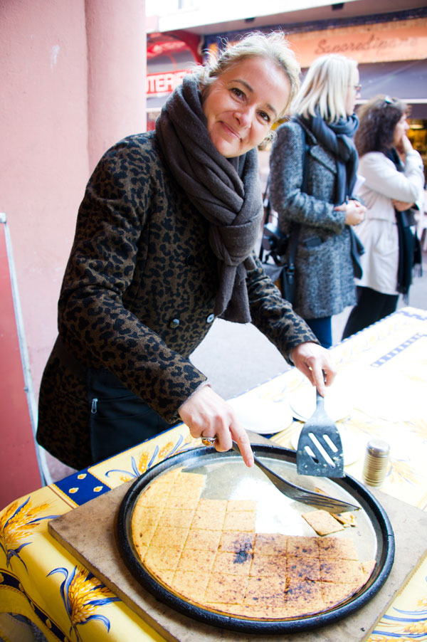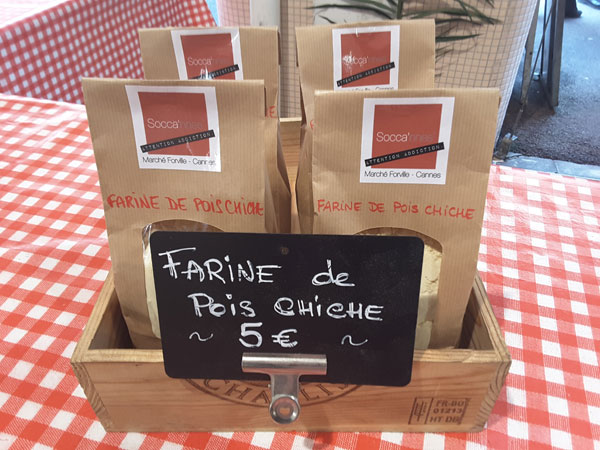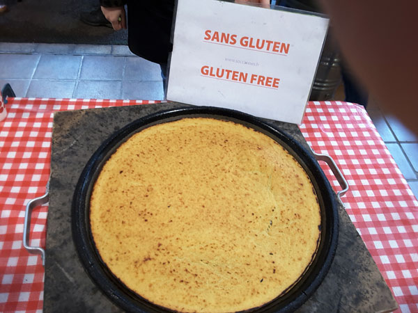 Deuxième arrêt: Socca’nnes. Une socca sans gluten cuite au four à socca et vendu fraîche sur le marché Forville par Barbara et Thomas Pietri.