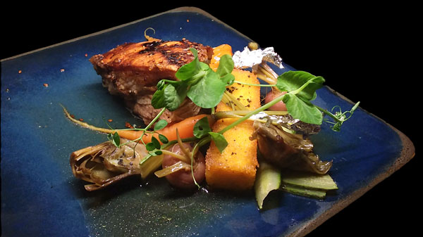 Rond Parisien juste marqué, Légumes du marché, Polenta rôtie: délicatement cuite à basse température, la viande goûteuse, tendre, parfumée, délivre tous ses sucs. Le jus aromatique apporte un bel ensemble de saveurs relevées. La polenta rôtie, ferme et fondante aromatisée au basilic, les petits légumes de la Provence cueillis à maturité avec le soleil du printemps, fermes et fondants, gorgés de sucs vitaminés, fleurissent dans l’assiette et leur couleurs éclatantes croquent joliment sous la dent.