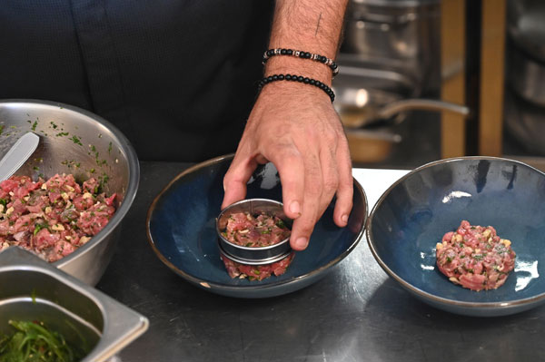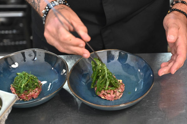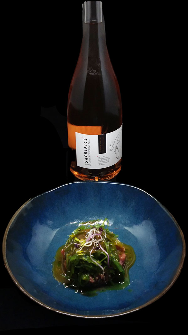 Tartare de Bœuf au Couteau, Wakamé thaÏ, Jaune d’œuf confit au Soja et Yusu: un délicieux boeuf finement coupé s’habille d’algue wakamé, se parfume à l’iode et se couronne du soleil d’un jaune d’œuf pour une magnifique version d’un tartare aux arômes d’Asie, pour un voyage exotique de fraîcheur et de saveurs d’ailleurs. Une merveille!
