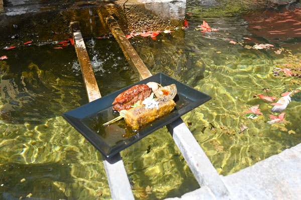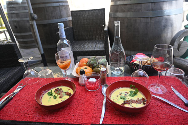 Gaspacho de Maïs, Get 27 comme une vinaigrette, Chips de Lard fumé: que du bonheur dans l’assiette! Tous les parfums du potager éclatent en bouche, la pousse de petit pois apporte son poids dans cette alliance de fraîcheur et de saveurs végétales. La lamelle de lard croustillante délivre une touche fermière et la longueur en bouche est de plus en plus agréable.