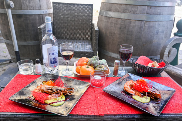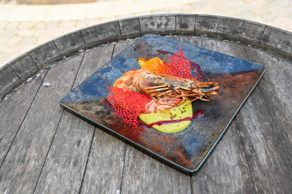 Gambas Jumbo et son Velouté de Courgettes, Coulis de Fruits rouges: chair ferme, symphonie de goût et de textures, cuisson et assaisonnement parfaits! La chair délicate de la gambas, superbement rôtie, est magnifiée par la douceur de l’avocat grillé, la douce amertume du pequillos, et portée au nues par la fraîcheur du yuzu et des fruits rouges. On croque biensûr les têtes pour se régaler des sucs! (rince-doigt fourni!)
