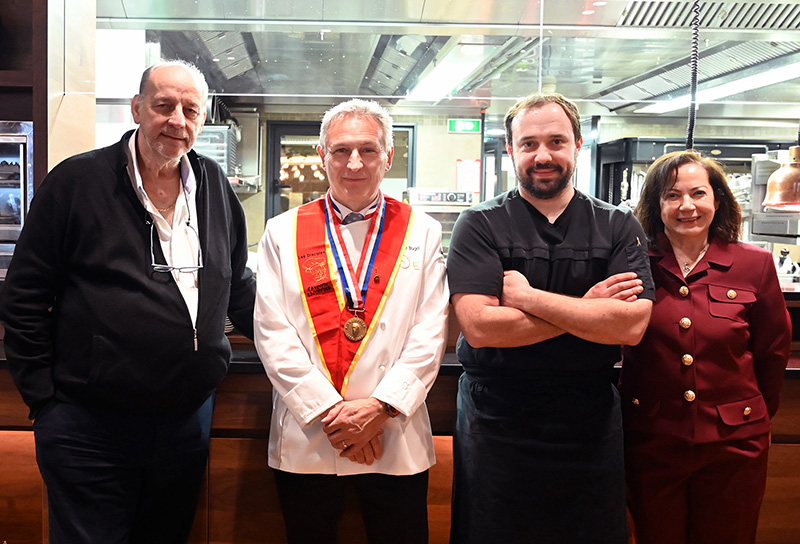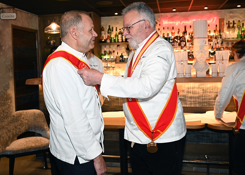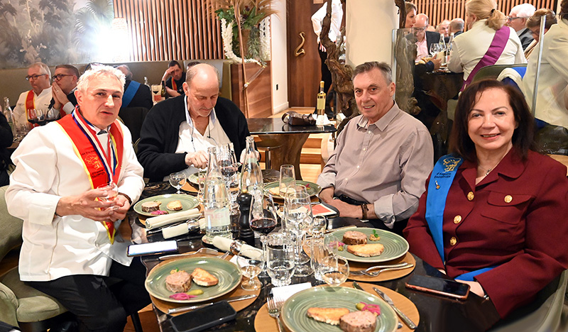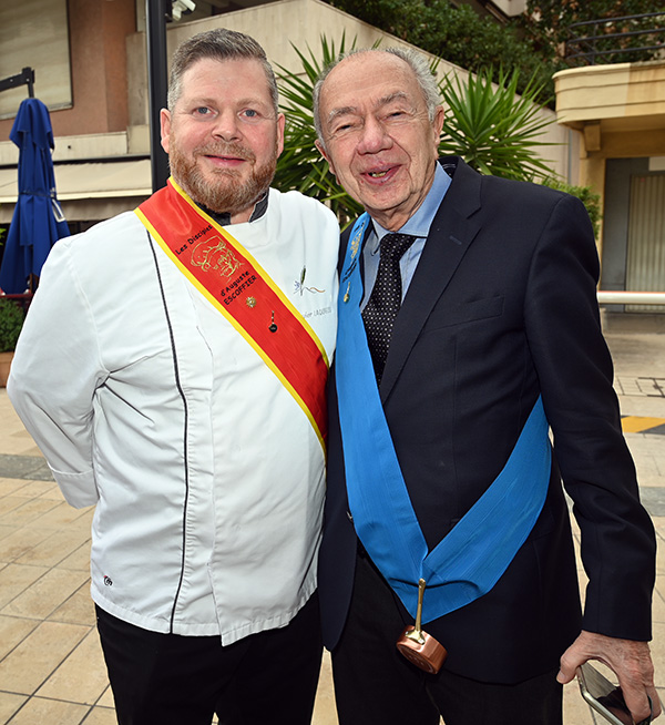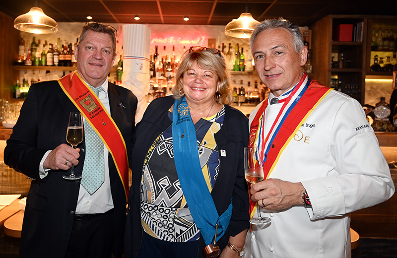 Impressionnés par le cérémonial, les impétrants se sont succédés sous la cuillère en bois du Président, Jean-Claude Brugel, Chef MOF du Café de Paris, qui leur a transmis « l’esprit Escoffier » par trois vigoureuses et joyeuses claques de cuiller sur les épaules. Ont été ainsi adoubés: Albert Escande (Restauratrice, propriétaire de La Table d’Elise), Martine Ackerman (Epicurienne), Julien Beaulieu (Chef Pâtissier Le Méridien Beach Plaza à Monaco).
