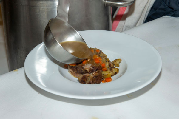 Joue de Veau dans un Bouillon à la Truffe et Petits Légumes. Accord mets-vin: Rouges Cuvée Indigène 2016 et Grande Cuvée 2015.