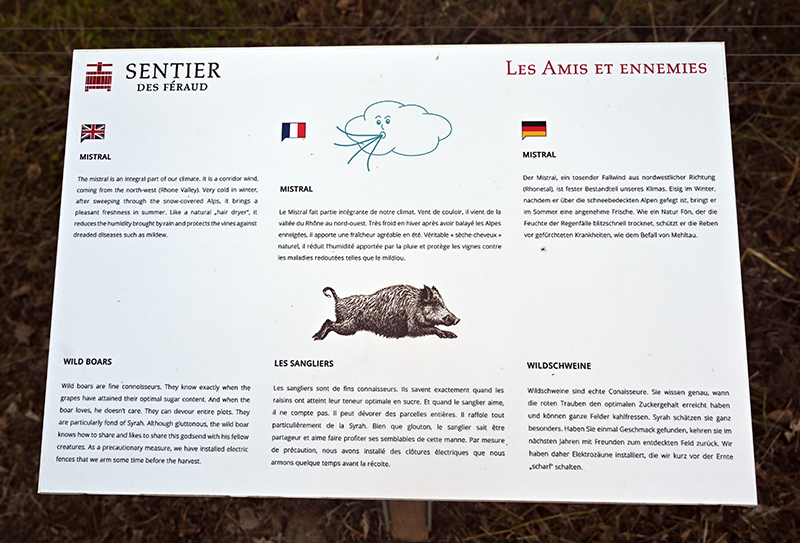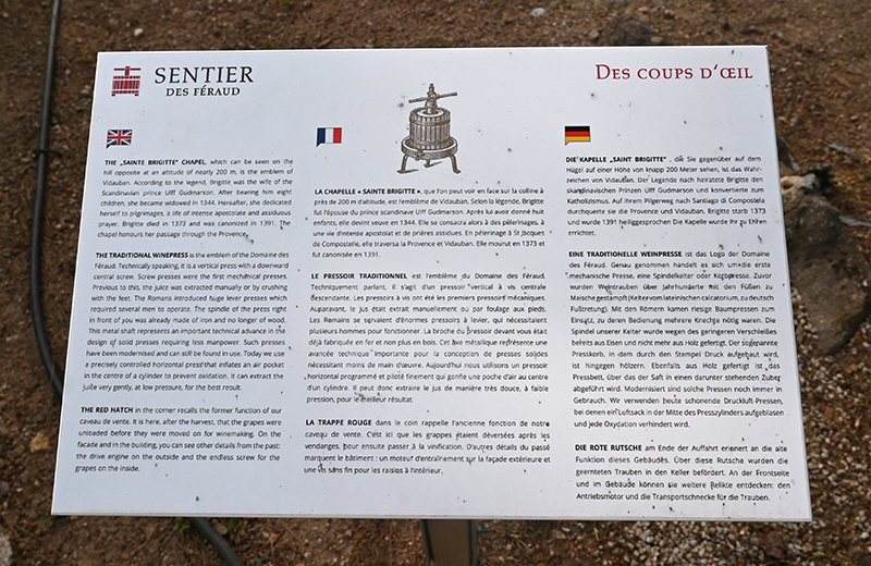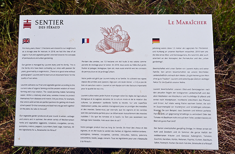 Lors de cette après-midi sensorielle, les invités accueillis par Markus Conrad ont été amenés à découvrir le Sentier des Féraud, un sentier Nature & Vigneron en 17 étapes, ainsi que le potager bio en permaculture. A travers vignes et forêts, la richesse de la faune et de la flore de cette zone géographique protégée qui doit son surnom de « Petite Afrique », leur a permis de imprégner de l’atmosphère nature et fruitée des splendides paysages atypiques.
