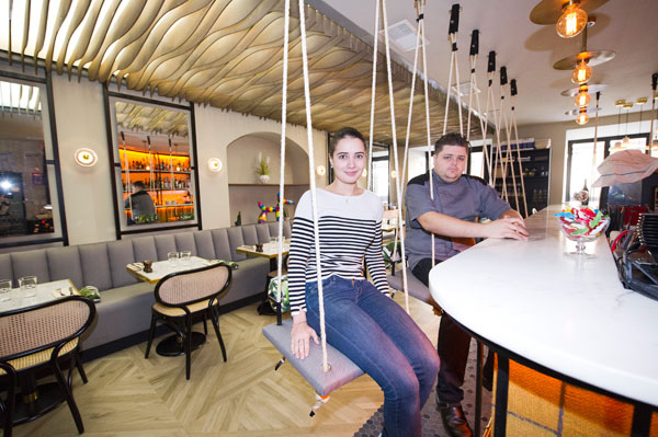 Du Costa Rica, Léa a rapporté les sièges balançoires du bar, Saint Petersbourg lui a inspiré le plafond lamellé ondulant à l’infini comme une vague. Dans un relaxant mix de musique lounge et chillout, les éclairages signés du designer britannique Tom Dixon baignent d’une douce luminosité la longue et confortable banquette grise face à la rangée de tables et de chaises bistrot. Aux beaux jours, la terrasse offre un espace privilégié, où les clients se disputent les faveurs d’une balancelle.