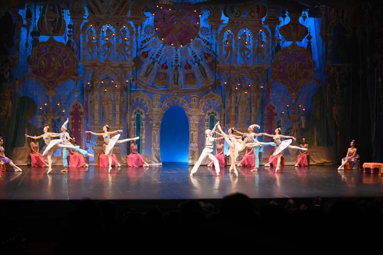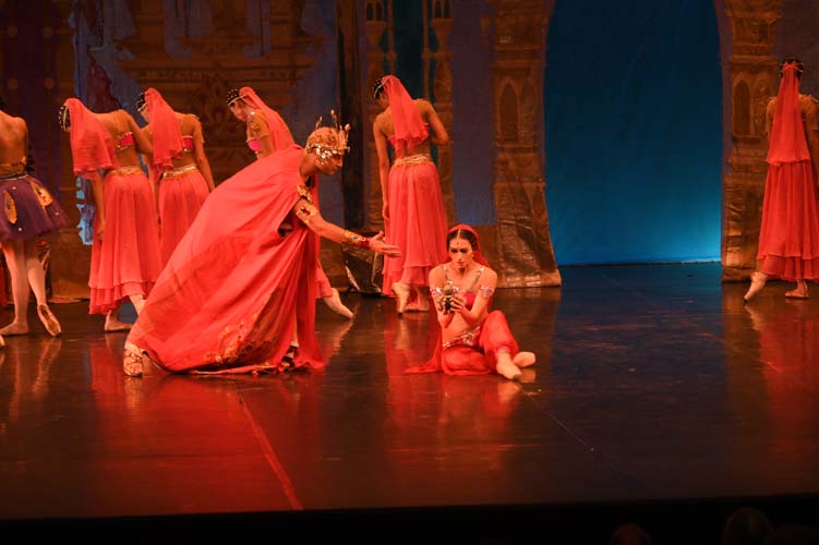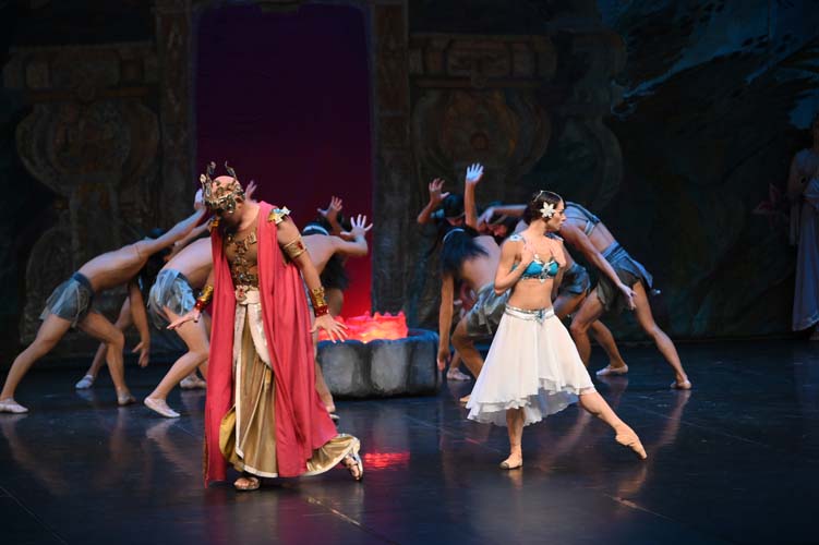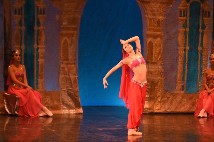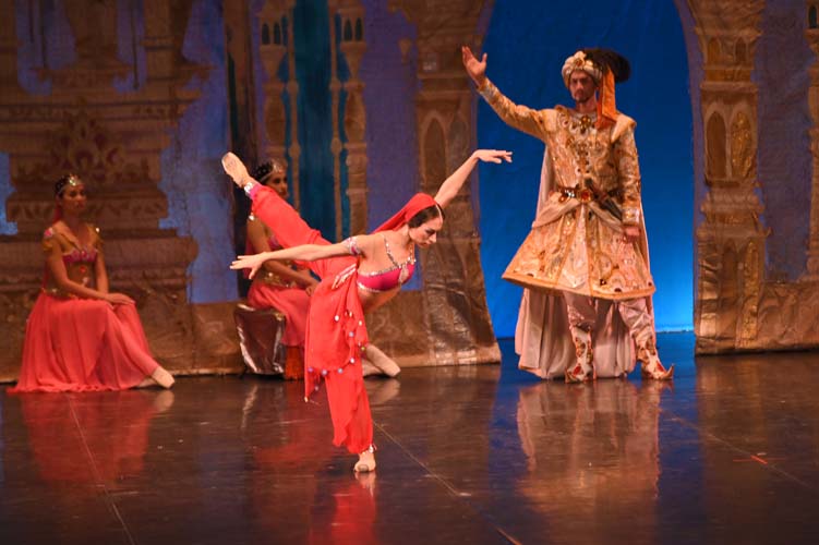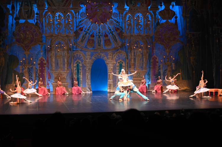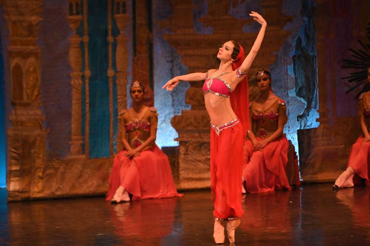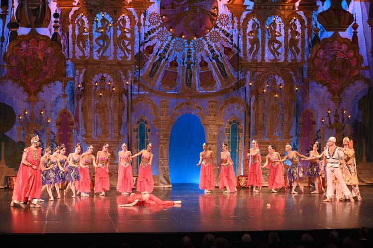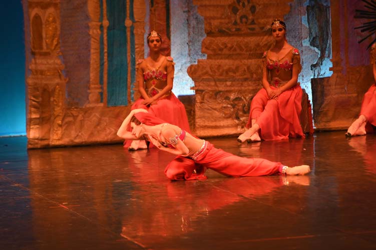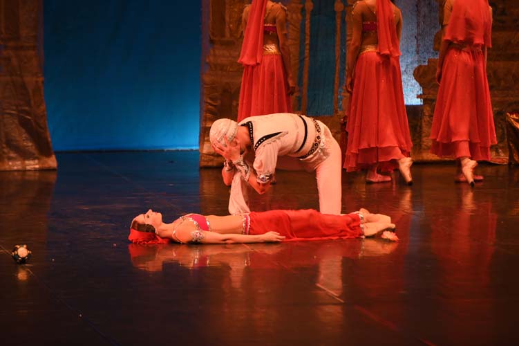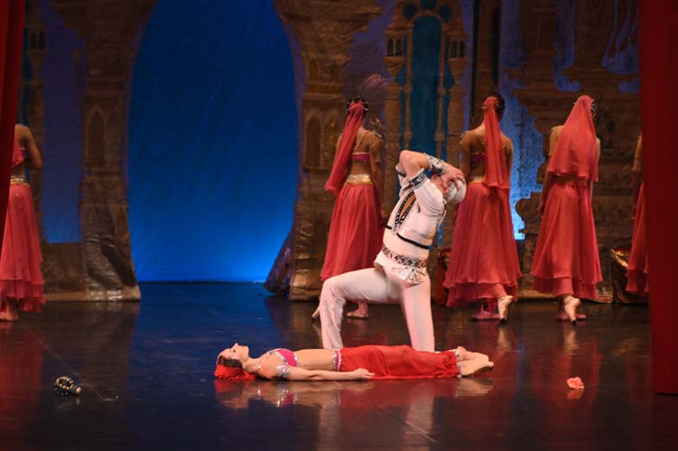Pendant trois heures, entrecoupées de deux entractes, les spectateurs ont pu admirer sur scène, les magnifiques décors de palais aux ornements somptueux inspirés du Taj Mahal et les paysages de montagnes enneigées. La virtuosité des danseurs revêtus de saris indiens pailletés d’or et les nombreuses silhouettes de ballerines-bayadères habillées de délicats tutus blancs interprétant des pas de deux à la perfection, contribuèrent à la magie de ce spectacle époustouflant et grandiose. Sur fond de drame, le ballet mêla les sentiments de fierté, de défi, de passion, de sensualité, de violence, qui s’affrontèrent et s’entrechoquèrent au fil des actes de l’opéra ballet.