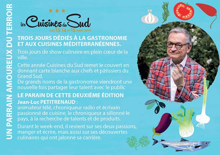 Le Festival Cuisines du Sud, organisé dans le cadre de la Fête de la Gastronomie – Goût de France, se déroulera du 13 au 15 septembre sur les rives de la Méditerranée. Cette année le Festival sera parrainé par le chroniqueur gastronomique et animateur de radio et de télévision, Jean-Luc Petitrenaud. L’édition 2019 donnera carte blanche aux chefs pâtissiers du Grand Sud et à leurs délices sucrés.