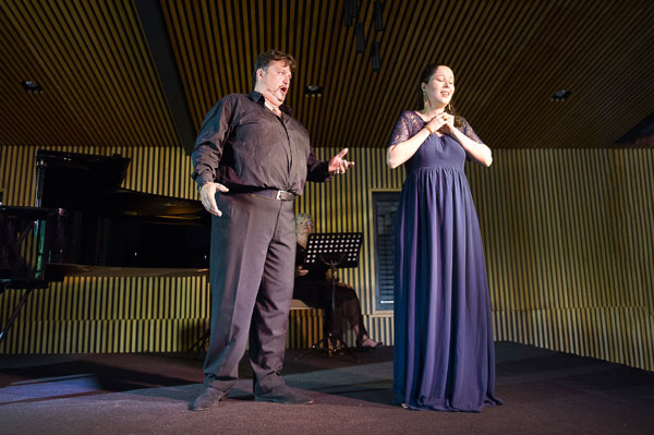 On resta ensuite dans le drame avec l’opéra La Bohème, où Puccini décrit avec subtilité et sensibilité l’existence misérable et pathétique des artistes qu’il a lui-même côtoyé lorsqu’il était étudiant au Conservatoire de Milan. Dans le duo Tatiana Probst et Olivier Grand, Mimi (atteinte de phtisie) confie à son ami le peintre Marcello, ses doutes et ses angoisses après sa rupture avec son amoureux Rodolfo. Malheureusement quand l’amour triomphera enfin, il sera trop tard, la mort les séparera. Après tous ces drames, un moment de douceur et de sérénité fut bienvenu avec la célèbre barcarolle des Contes d’Hoffmann où, dans l’ivresse d’un soir d’été, Violette Polchi, Tatiana Probst et Olivier Grand ont chanté en chœur « Belle nuit o nuit d’amour… »