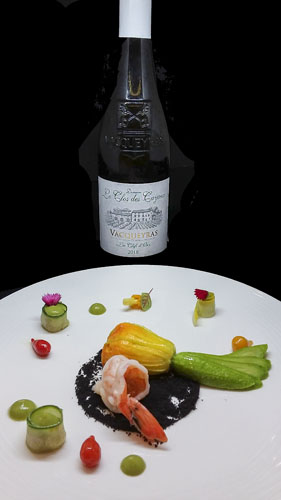 Crevettes sauvages « Obsiblue » mi-cuites à la vapeur, Courgette Fleur farcie à la Royale de Merlan safranée, Crumble à l’Encre de Seiche et Anchois, Courgette en texture. La dentelle dorée de la fleur de courgette, écrin de l’exceptionnelle Royale de Merlan, explosion de goûts safrané et iodé, se marie à merveille avec la chair délicate des crevettes sauvages. Les perles de poivrons éclatent en bouche, pour une symphonie de notes fraîches du potager en contrepoint à la saveur de l’encre de sèche dans un beau mélange de textures.