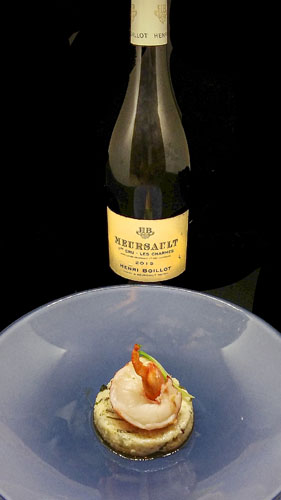 Crevettes sauvages « Obsiblue » mi-cuites à la vapeur, Courgette Fleur farcie à la Royale de Merlan safranée, Crumble à l’Encre de Seiche et Anchois, Courgette en texture. La dentelle dorée de la fleur de courgette, écrin de l’exceptionnelle Royale de Merlan, explosion de goûts safrané et iodé, se marie à merveille avec la chair délicate des crevettes sauvages. Les perles de poivrons éclatent en bouche, pour une symphonie de notes fraîches du potager en contrepoint à la saveur de l’encre de sèche dans un beau mélange de textures.