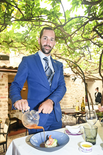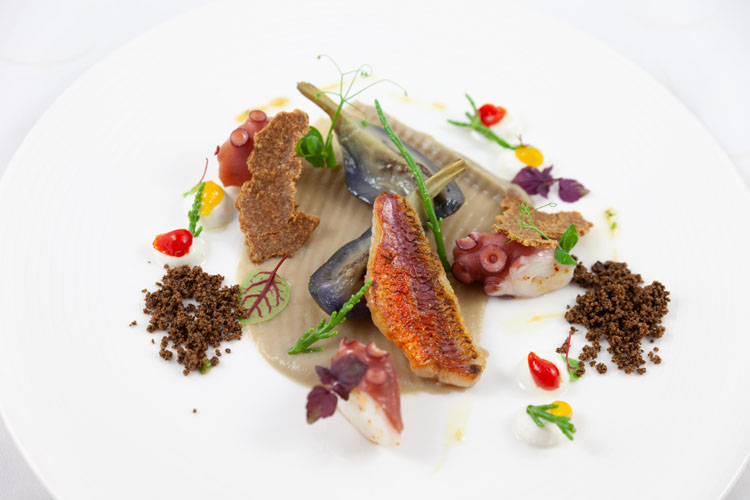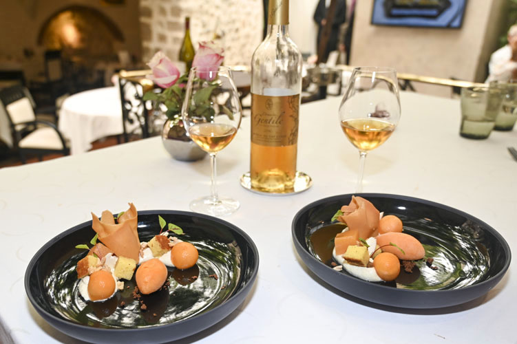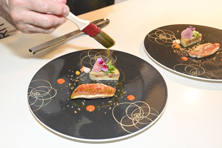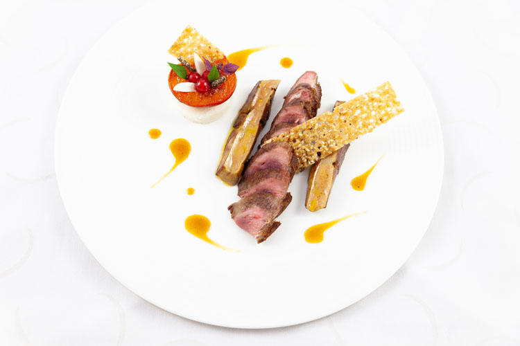 Rouget Barbet cuit au « Teppan yaki », l’Aubergine rôtie et son Caviar aromatisé à la Pâte de Sésame, Neige de Poutargue. La finesse de la chair du barbet de la pêche locale, à la chair à la fois croustillante et fondante, cuite à la perfection, se plaît en compagnie des légumes de Provence ensoleillés et colorés. Jamais la Provence ne s’est aussi bien exprimée en saveurs!
