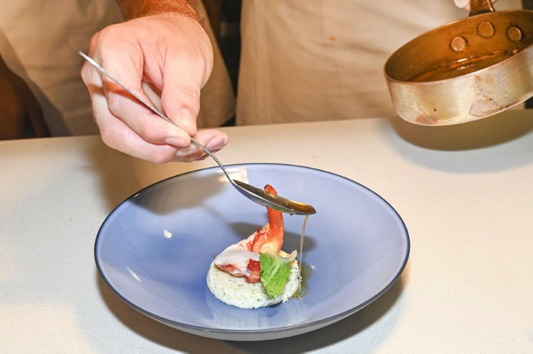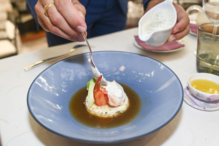 Le Homard Bleu rôti, Polenta blanche aux Algues, Jus au Curry Vert, Condiment Raïta. Cuit à la perfection, le homard, aromatique et délicat, sur son île de polenta blanche aux algues vertes, nage plaisamment de bonheur dans une bisque colorée, forte en sucs de carapace. Le curry vert et ses notes de fraîcheur – coriandre, cumin, citronnelle, gingembre – prolongent le plaisir au palais et on prend goût à la rafraîchissante sauce Raïta!