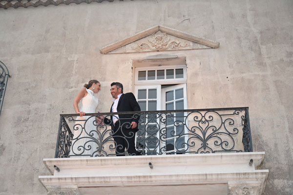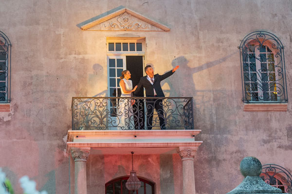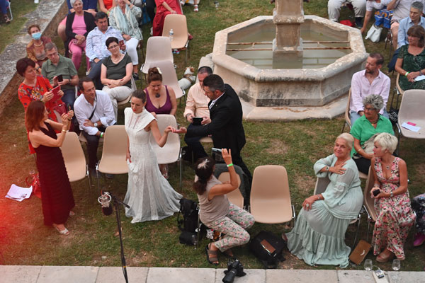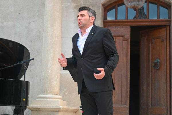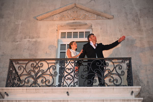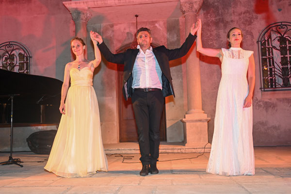 Ah, l’amour! Toujours l’amour… Roméo et Juliette, L’Arlésienne, La Traviata, Manon… autant d’amours contrariées, de tragédies amoureuses, de relations mélodramatiques, où l’amour fou le dispute à une vie de luxe et de plaisirs. Les drames amoureux ont inspiré aux compositeurs et librettistes les pages les plus vibrantes et les plus poignantes de l’opéra. Les interprétations tour à tour émouvantes, dramatiques ou exaltées des héros et héroïnes par Chloé Chaume et Mickael Spadaccini ont ébloui l’auditoire de mélomanes réunis sur le parvis du Château, qui, savamment illuminé pour mettre en valeur l’ocre de ses murs et colonne, évoquait un théâtre grec, temple d’émouvantes tragédies. Le balcon et la fontaine du Château au milieu du public ont servi de scènes théâtrales aux épisodes amoureux.