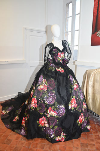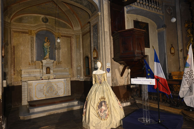 Aux côtés du couturier, une somptueuse robe tout en drapée, s’inspirant du style rococo des salons du XVIIIème siècle, arbore une toile de François Boucher sur fond de mousseline champagne, de rubans, de fleurs, de soies brodées, le tout rehaussé par un corset de dentelle agrémentée de cristaux Swarovski. Cette œuvre d’art exposée au milieu de la chapelle composa un décor de luxe au discours du Maire de la Ville Jérôme Viaud, comme pour rappeler qu’à Grasse, l’histoire ne se limite pas aux parfums.