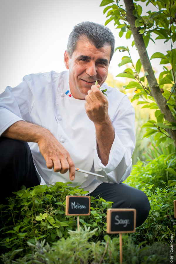 Jérôme Héraud est Champion de France de Cuisine 2004, Vice-champion de France des desserts 2000 et 2001, Disciple d’Escoffier International, membre de l’Académie Nationale de Cuisine et Maitre Restaurateur, un titre qu’il a obtenu en juillet 2013. Ce chef qui a grandi 15 ans durant en Côte d’Ivoire, du côté du port de San Pedro, a su rester simple, loin du bling-bling et des paillettes de la French Riviera. Il revendique des valeurs telles que savoir-faire, authenticité et générosité. Le chef puise ses inspirations dans l’atmosphère naturelle et provençale de son jardin niché entre arbres centenaires et buissons fleuris, son fameux carré d’herbes aromatiques qu’il cultive avec passion: thym, menthe, bergamote, citronnelle… Cet adepte des produits de terroir met un soin particulier à débusquer des fournisseurs amoureux de leurs produits.